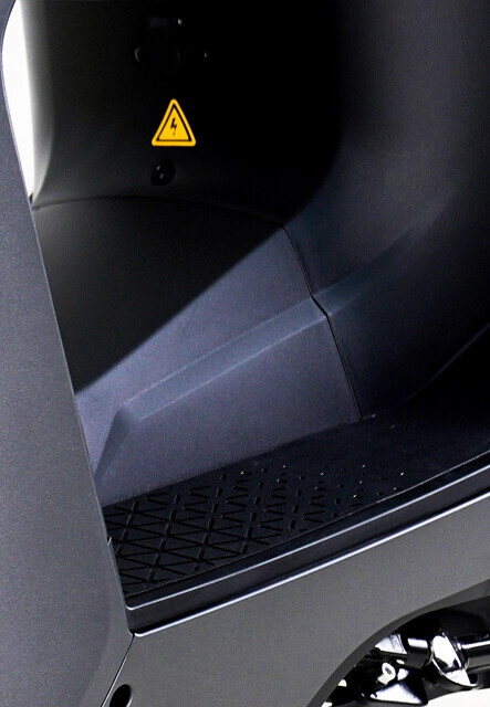 O espaço de armazenamento sob o assento é extra grande, com um volume de 35 litros. Há espaço para um capacete ou para uma segunda bateria opcional, aumentando significativamente a autonomia.